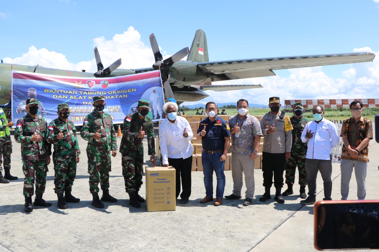 NASIONAL – Panglima TNI, Sebanyak 50 tabung berisi oksigen, 50 konsentrator, 1000 APD dan 150 ribu masker mendarat di base ops Lanud Silas Papare, Kamis (23/7/2021). Hal tersebut sebagai wujud perhatian Panglima TNI kepada masyarakat Papua