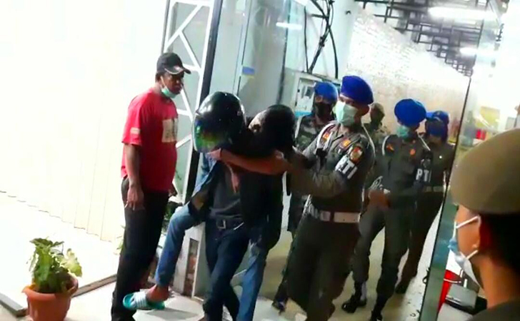 Dengan memakai helm, pria yang terjaring razia menggendong rekannya yang masih pingsan saat diamankan petugas.