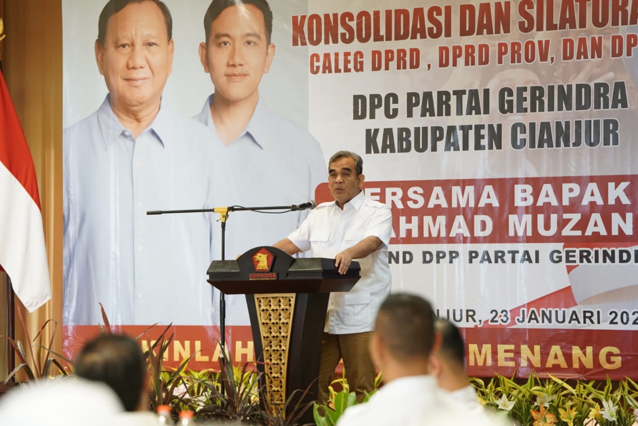 Sekjen Partai Gerindra Ahmad Muzani menghadiri konsolidasi DPC Gerindra Kabupaten Cianjur pada Selasa (23/1). Dalam sambutannya, Muzani meminta kader untuk berjuang memenangkan Prabowo-Gibran Gerindra di Cianjur pada Pilpres 2024 nanti.