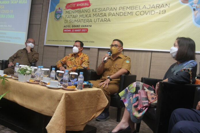 Dinas Komunikasi dan Informatika (Diskominfo) Sumatera Utara (Sumut) saat menggelar diskusi bersama puluhan wartawan terkait kesiapan pembelajaran tatap muka di masa pandemi Covid-19 di Hotel Grand Kanaya Medan, Selasa (23/3/2021) mengungkapkan hal tersebut.