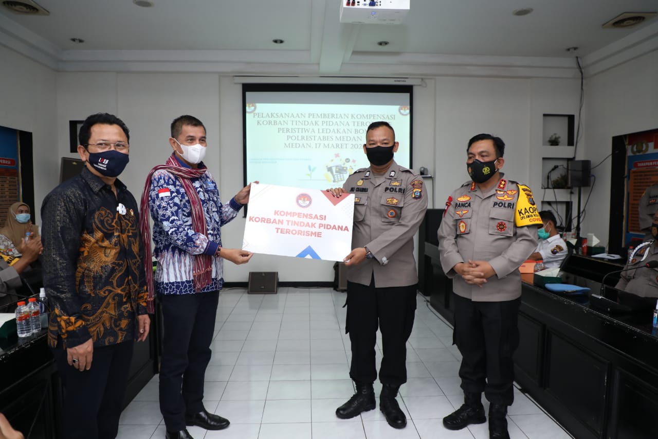 MEDAN – Tujuh korban bom aksi terorisme yang terjadi di Polrestabes Medan menerima bantuan dari Lembaga Perlindungan Saksi dan Konsumen LPSK. Di Aula Rupatama Mapolrestabes Medan, pada Rabu (17/3/2021).