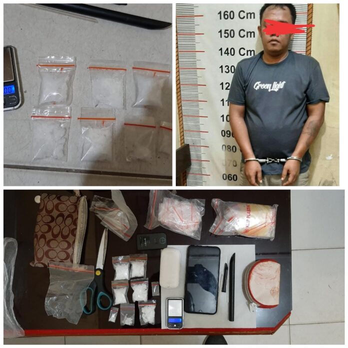 Barang bukti turut diamankan, dua bungkus plastik putih les merah ukuran sedang berisikan narkotika jenis sabu,satu bungkus plastic putih les merah ukuran kecil berisi sabu,empat buah sekop teridir dari dua buah berbentuk pipet hitam dan dua buah skop pipet warna putih,satu buah gunting,satu buah timbangan elektrik, Dua buah dompet terdiri dari satu buah dompet kecil berisikan empat puluh.