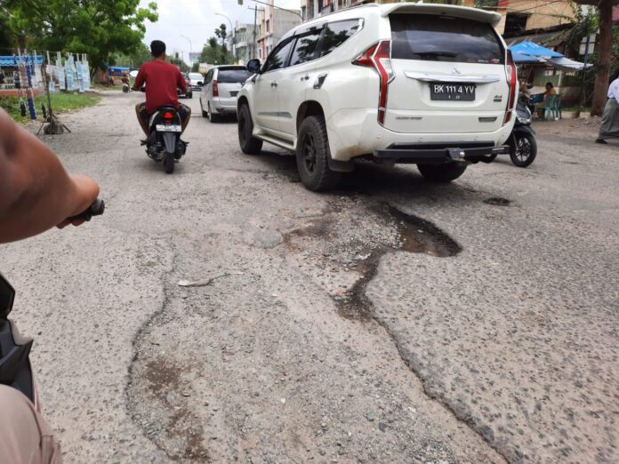 LABUHANBATU – realitasonline.id | Setahun lebih Jalan SM Raja dekat Kantor Bupati Labuhanbatu di Kota Rantauprapat kupak kapik alias rusak parah.