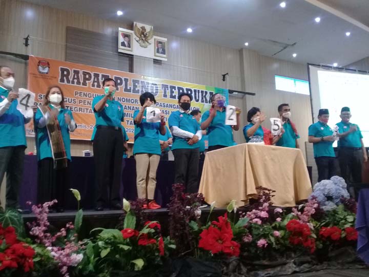 BERASTAGI –  Pleno KPU Karo dengan agenda pengundian nomor urut berlangsung di ruangan Hall Sinabung Hotel, Kamis ( 24/9/ 2020 ) dihadiri Bupati Karo, Ketua DPRD Kabupaten Karo, unsur Forkopimda Kabupaten Karo, kelima pasangan calon (paslon) didampingi fungsionaris partai pengusung dan sejumlah undangan lainnya.