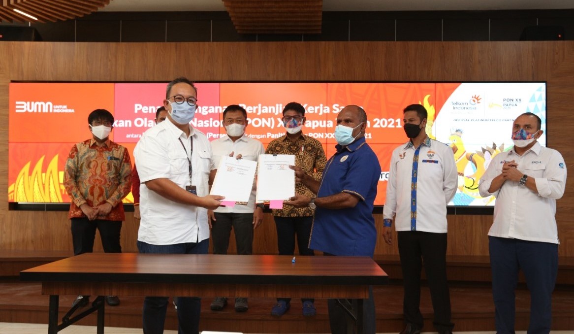 Telkom secara resmi hadir sebagai Official Platinum Telco Partner PON XX Papua 2021, setelah dilakukannya penandatanganan Perjanjian Kerja sama (PKS) antara SVP Corporate Communication & Investor Relation Telkom Ahmad Reza dengan Ketua Harian PB PON XX, Yunus Wonda disaksikan Menteri Komunikasi dan Informatika Johnny G. Plate dan Direktur Utama Telkom Ririek Adriansyah di Media Center PON XX di Gedung Sasana Krida Provinsi Papua, Kamis (23/9).
