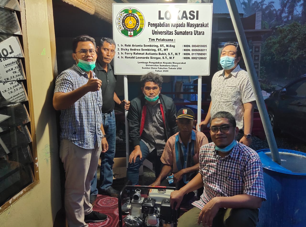 Langkat-Empat orang dosen Fakultas Teknik USU melakukan pengabdian dalam bentuk pembangunan irigasi air tanah dangkal untuk memenuhi kebutuhan air sawah yang selama ini hanya memanfaat air tadah hujan. Bantuan ini diberikan langsung kepada kelompok tani Setia Tani di Desa Sambirejo, Kecamatan Binjai, Kabupaten Langkat, pada 03 November 2020.