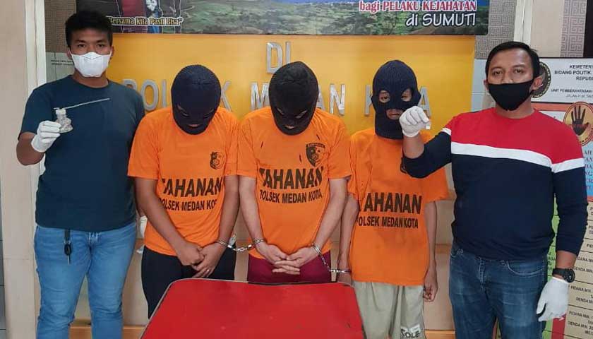 Ketiganya tersangka adalah, HJP (26), warga Jalan Gedung Arca Gang Sehat, AW (29), warga Jalan HM Joni Gang Istimewa dan MD (20), warta Jalan Bahagia.