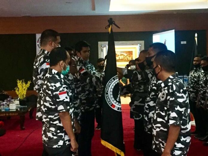 Upacara pelantikan DPD Bapera Kabupaten Paluta periode 2020-2025 ditandai dengan penyerahan bendera pataka oleh ketua OKK DPP Bapera Gunawan Hidayat kepada ketua DPD Bapera Paluta Asrul Ansori Siregar SKom. (ASR)