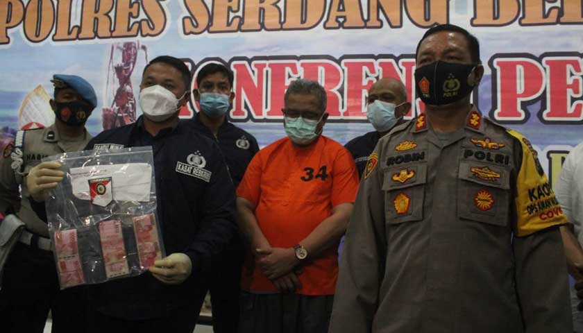 Kapolres Serdang Bedagai AKBP Robin Simatupang SH MHum didampingi Kasat Reskrim AKP Pandu Winata SH SIK, MH, KBO Reskrim, IPTU Adi Santika, Kanit Tipikor IPTU E. Sidauruk, Jumat (22/1/2021) malam di Mapolres Sergai, dalam konferensi pers kepada wartawan mengatakan bahwa tersangka adalah oknum Kadis Sosial Pemkab Serdang Bedagai, inisial IF, S.Sos 53 tahun.
