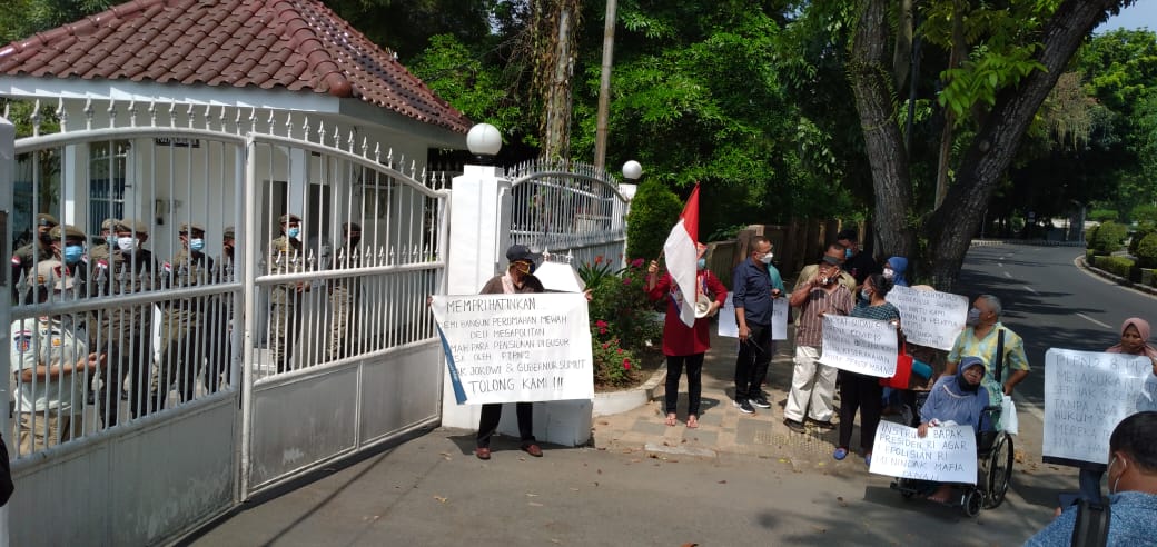 MEDAN – Sejumlah pensiunan PTPN II kembali lagi melakukan unjuk rasa di rumah dinas Kantor Gubernur Sumatera Utara, Rabu (24/2/2021) menuntut Gubernur Sumut agar menyelesaikan permasalahan perumahan pensiunan PTPN II yang sudah ditempati selama puluhan tahun.
