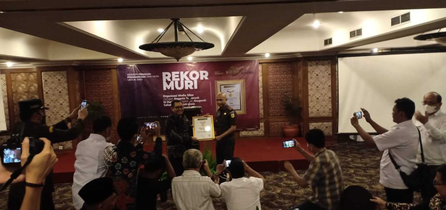 Setelah menerima piagam penghargaan Sahabat Pers Indonesia dari Ketua Umum SMSI Firdaus, ia dipersilakan naik panggung.