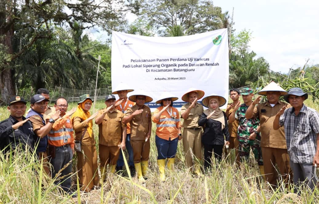 Batangtoru – PT Agincourt Resources (PTAR) bersama Dinas Pertanian Tapanuli Selatan, Balai Penyuluh Pertanian Batangtoru, kelompok tani binaan, serta stakeholder terkait, melakukan panen perdana uji varietas benih padi Siporang organik di area persawahan Kelompok Tani Aek Pahu, Desa Napa, Kecamatan Batangtoru, Senin (20/3). Hasil pengubinan panen perdana ini sebanyak 5,2 ton/ha.