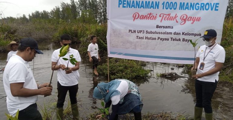 ACEH SINGKIL – Melalui dana CSR, PLN UP3 Subulussalam melakukan penanaman Pohon Mangrove di Destinasi Wisata Teluk Bayur Desa Kayu Menang Kecamatan Singkil Kabupaten Aceh Singkil.
