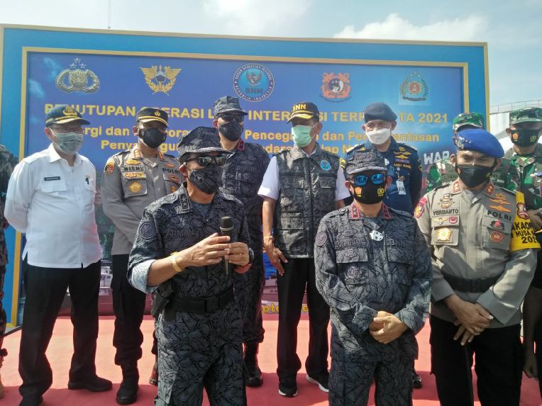 MEDAN – Deputi Pemberantasan Badan Narkotika Nasional (BNN), Irjen Pol Arman Depari memimpin penutupan Operasi Laut Interdiksi Terpadu di Pelabuhan Ujung Baru, Dermaga 103, Belawan, Kota Medan, Sabtu (25/9/2021).