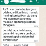 Selanjutnya, IDS menerima pesan Whats App dari Indra Heriadi dengan tulisan mengancam akan melaporkan IDS ke polisi dengan tuduhan penggelapan. “Om Indra kirim pesan ke saya pak, isi nya : As Tan, ini om indra. tan gimana udah ada dikasi tahu mamakmu tlng kembalikan aja uangnya jgn memperuncing masalah om tunggu sampai minggu ini. Lw tidak ada tindakan yg om ambil terpaksa om buat kepolisi dalam hal ini penggelapan. Coba intan pikir baik2,” kata IDS, Rabu (21/12/2022) sambil mengirim screenshot postingan Whats App Indra Suhedi ke IDS ke awak media.