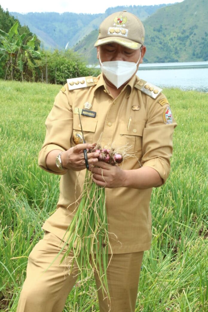 TAPUT – realitasonline.id | Bupati Tapanuli Utara Drs. Nikson Nababan , M. Si didampingi Kepala BPS Ester Sitorus sejumlah OPD dan Camat melakukan panen perdana Penangkar Benih Bawang Merah Kelompok Tani Taput Hebat Huta Lontung Kecamatan Muara, Senin (25/1) 2021.