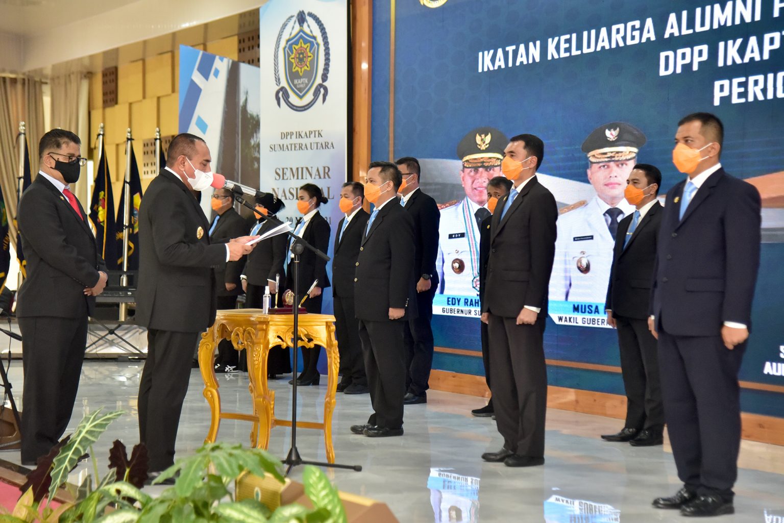 MEDAN – Gubernur Sumatera Utara (Sumut) Edy Rahmayadi mengukuhkan Dewan Pengurus Provinsi (DPP) Ikatan Keluarga Alumni Pendidikan Tinggi Kepamongprajaan IKAPTK Sumut Periode 2021-2026, di Aula Tengku Rizal Nurdin, Rumah Dinas Gubernur, Jalan Jenderal Sudirman No 41 Medan, Sabtu (20/3/2021).