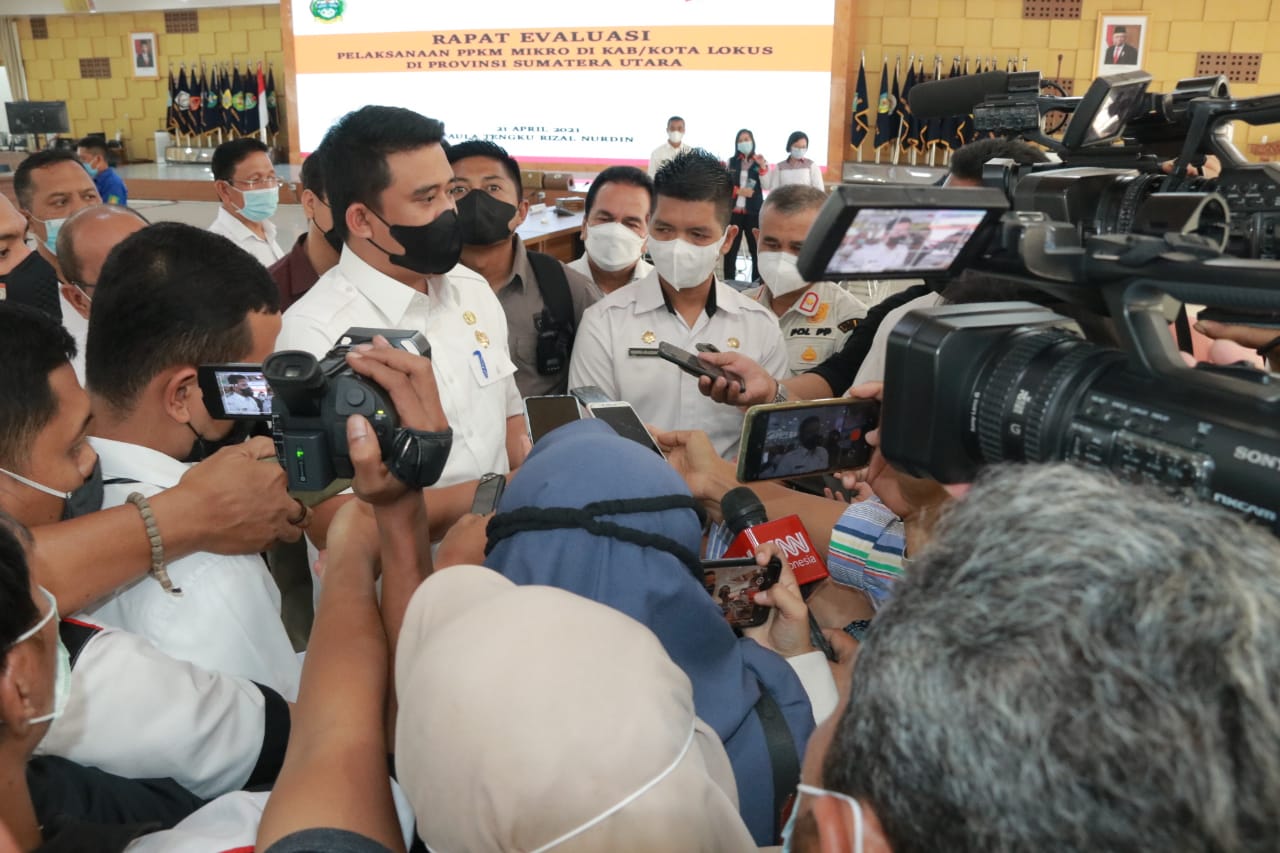 “Apabila teman-teman wartawan ingin melakukan doorstop di Kantor Wali Kota, kita sudah sediakan tempatnya. Di samping itu kita juga sudah menyediakan satu unit mobil jenis Hiace bagi teman-teman jurnalis yang ingin ikut melakukan peliputan. Ikuti saja saya, jika nanti kegiatan sidak akan saya kasih tahu. Jika dari awal saya kasih tahu, nanti nggak jadi sidaknya,” kata Bobby Nasution. Ketika doorstop dengan wartawan usai menghadiri Rapat Evaluasi Pelaksanaan pemberlakukan Pembatasan kegiatan masyarakat (PPKM) Mikro di Aula T Rizal Nurdin Rumah Dinas Gubsu, Selasa (21/4).