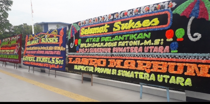 Karangan bunga tersebut sebagian di halaman depan Kantor Gubsu dan sebagian lainnya di trotoar luar pagar depan kantor pusat pemerintahan Sumut itu.