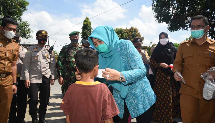 TEBINGTINGGI – Ketua TP-PKK Sumut Bagi-bagi Masker ke Warga Tebing Tinggi. Pemerintah Provinsi (Pemprov) Sumatera Utara (Sumut) bersama seluruh unsur Forkopimda terus berupaya melakukan langkah pencegahan penyebaran dan penularan Covid-19 yang diselaraskan dengan upaya pemulihan ekonomi masyarakat. Disiplin menjalankan protokol kesehatan menjadi kunci utama, dimana keluarga adalah benteng pertama sebelum seseorang keluar dari rumah.