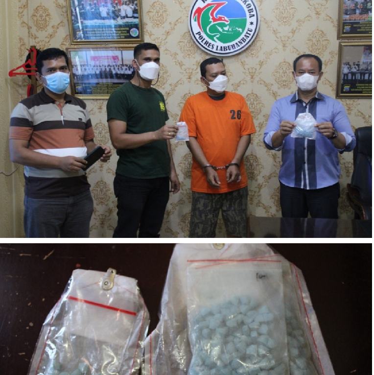 RANTAUPRAPAT – Polres Labuhanbatu menangkap residivis kurir Narkoba dan menyita barang bukti sebanyak 200 butir pil ekstasi seberat 60 gram, Minggu (26/9/2020).