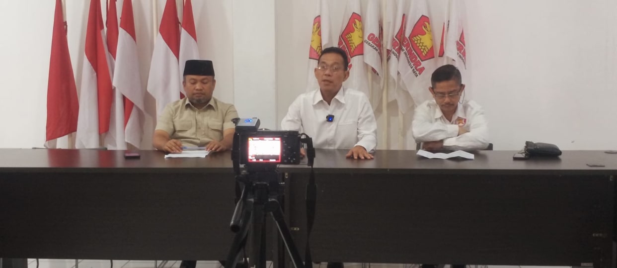 Ketua DPD Partai Gerindra Sumut, H Gus Irawan Pasaribu SE, Ak, MM, CA (tengah) didampingi Sekretaris Umum Sugiat Santoso SE, MSP (kiri) dan Ketua Panitia Natal Nasional Partai Gerindra Jhon Sari Haloho saat memberikan keterangannya kepada wartawan di Kantor Gerindra Sumut Jalan Sudirman Medan.