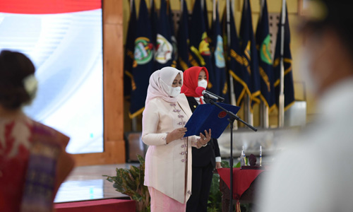 MEDAN – Ketua Tim Penggerak (TP) Pemberdayaan Kesejahteraan Keluarga (PKK)  Sumut Nawal Lubis, yang juga Ketua Dewan Kerajinan Nasional Daerah (Dekranasda) Sumut melantik 10 Ketua TP PKK dan Dekranasda Kabupaten/Kota di Aula Tengku Rizal Nurdin, Rumah Dinas Gubernur, Jalan Jenderal Sudirman Nomor 41 Medan, Jumat (26/2/2021).