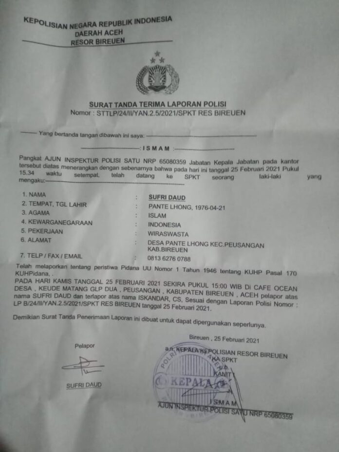 Adapun laporan polisi itu terdaftar dengan Nomor STTLP/ 24/ II/ YAN.2.5/ 2021/ SPKT RES BIREUEN.