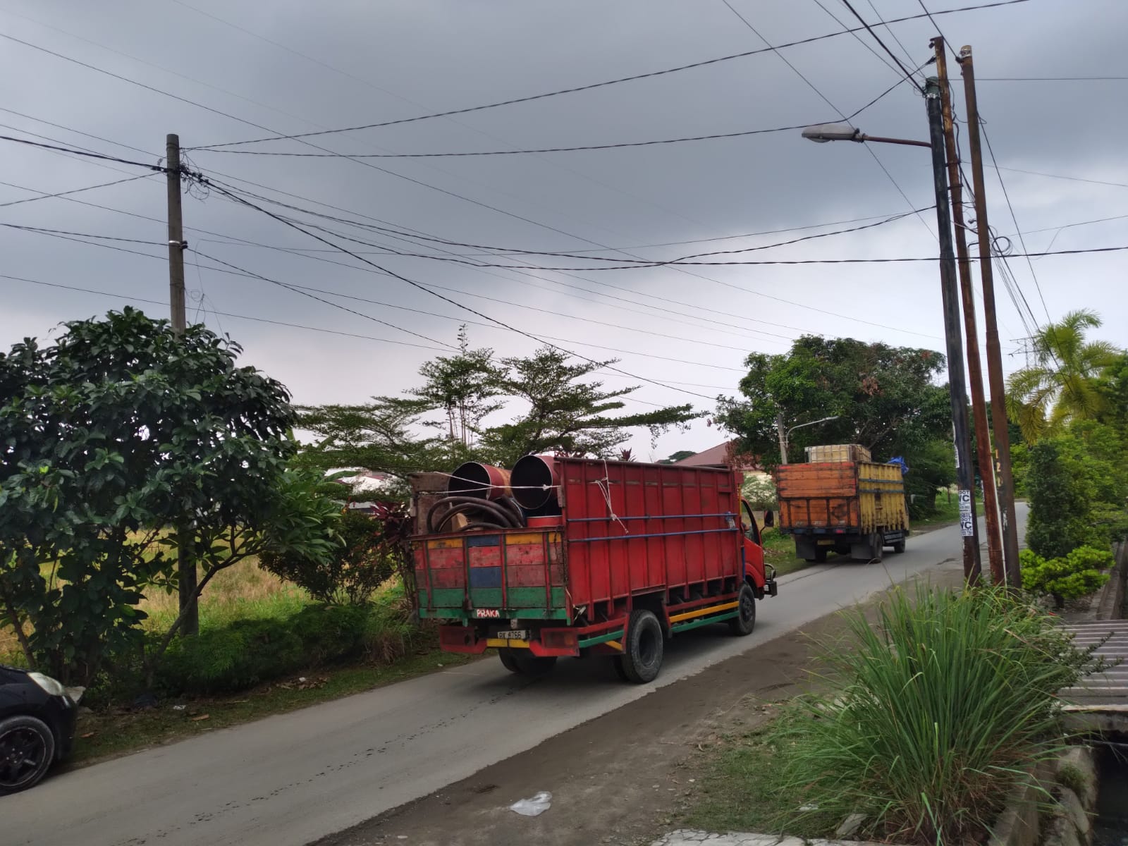 2 truk dan 1 pickup mengangkut tong, drum, slang dan pipa-pipa diduga alat pengolahan BBM beserta BBM jenis solar ke Polda Sumut.