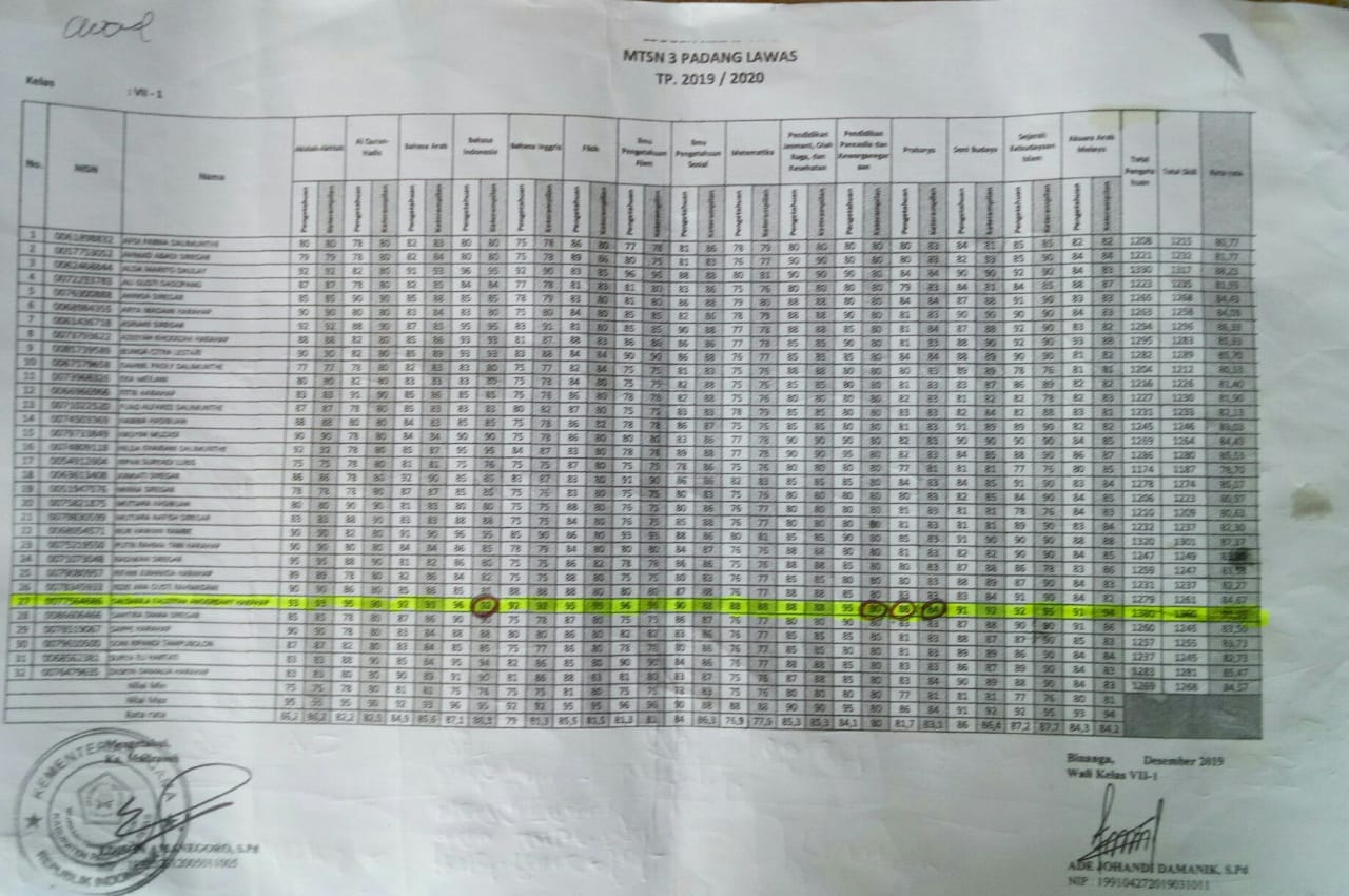Angka tersebut sudah ditandatangani Wali Kelas VII.1 dan Kepala MtsN III Palas Edison Amanegoro,S.Pd.