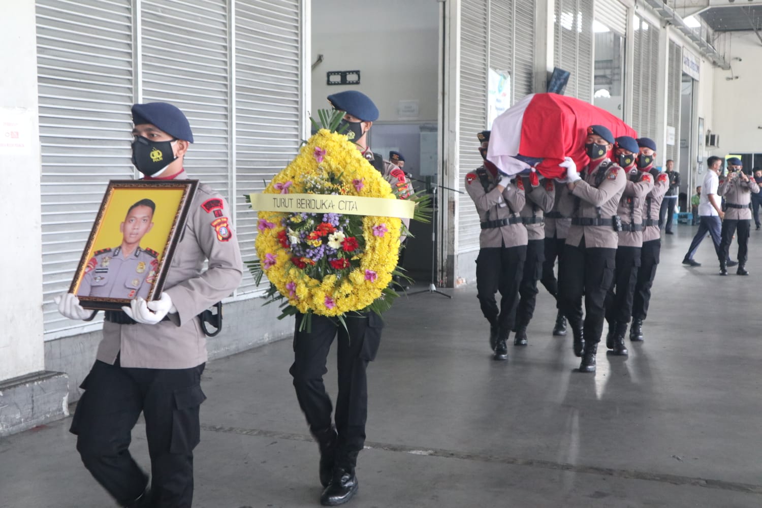 MEDAN – Satuan Brimob Polda Sumut melakukan acara penyambutan terhadap jenazah Bharatu Anumerta Muhammad Kurniadi Sutio, Senin (27/9/2021). Kegiatan itu dipimpin langsung Danyon B Pelopor Satuan Brimob Polda Sumut, Kompol Endra Budianto di Terminal Cargo Bandara Kualanamu Internasional, Kabupaten Deliserdang.