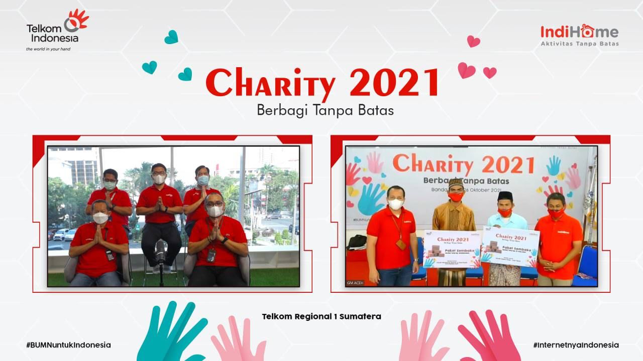 Di Telkom Regional 1 penyerahan charity disaksikan oleh para General Manager Witel secara online di 3 lokasi diantaranya Witel Aceh kepada Dayah Raudhatul Hikmah Al-Wasliyyah dan Dayah Alamul Huda, Witel Sumut kepada Komunitas BOMS Becak Siantar dan Witel Sumsel kepada Rumah Asuh Tahfidz Syamsi Qusda Putra. Bantuan yang diberikan berupa penyaluran paket sembako dan fasilitas pendidikan bagi masyarakat yang terdampak pandemi.