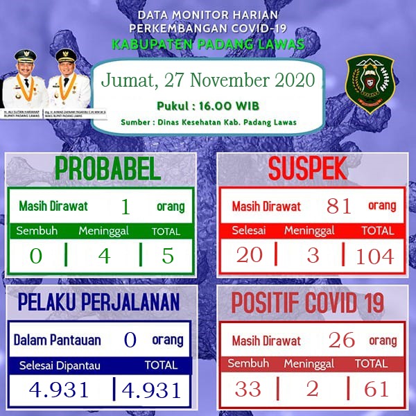 ” Sesuai dengan hasil laporan yang diterima dari Dinas Kesehatan pertanggal 27/11/2020 ada kenaikan 3 orang hasil sembuh,” jelas Marza Jannova.