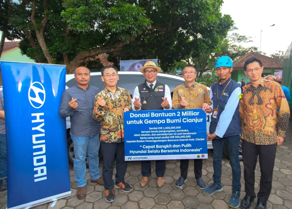 Cianjur – PT Hyundai Motor Manufacturing Indonesia (HMMI) dan PT Hyundai Motors Indonesia (HMID) bersama-sama memberikan donasi kepada para korban Gempa di Cianjur pada Senin (21/11/22). Donasi tersebut diberikan langsung kepada Ridwan Kamil, Gubernur Jawa Barat di salah satu Posko Peduli Gempa Cianjur, SMKN 2 Cilaku pada Jumat (25/11/22) oleh Yoon Seok Choi, Presiden Direktur PT Hyundai Motor Manufacturing Indonesia dan Makmur, Chief Operating Officer PT Hyundai Motors Indonesia.