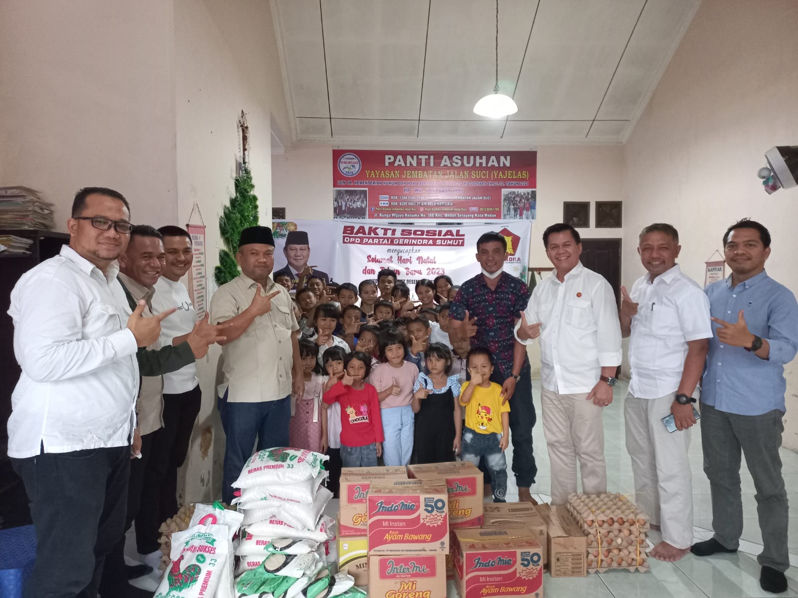 MEDAN-Gerindra Sumut kunjungi Panti Asuhaan Jembatan Jalan Suci rayakan Natal dan Tahun Baru bersama puluhan adik-adik Panti Asuhan di Jl. Bunga Wijaya Kesuma, Medan Selayang, Selasa (27/12).
