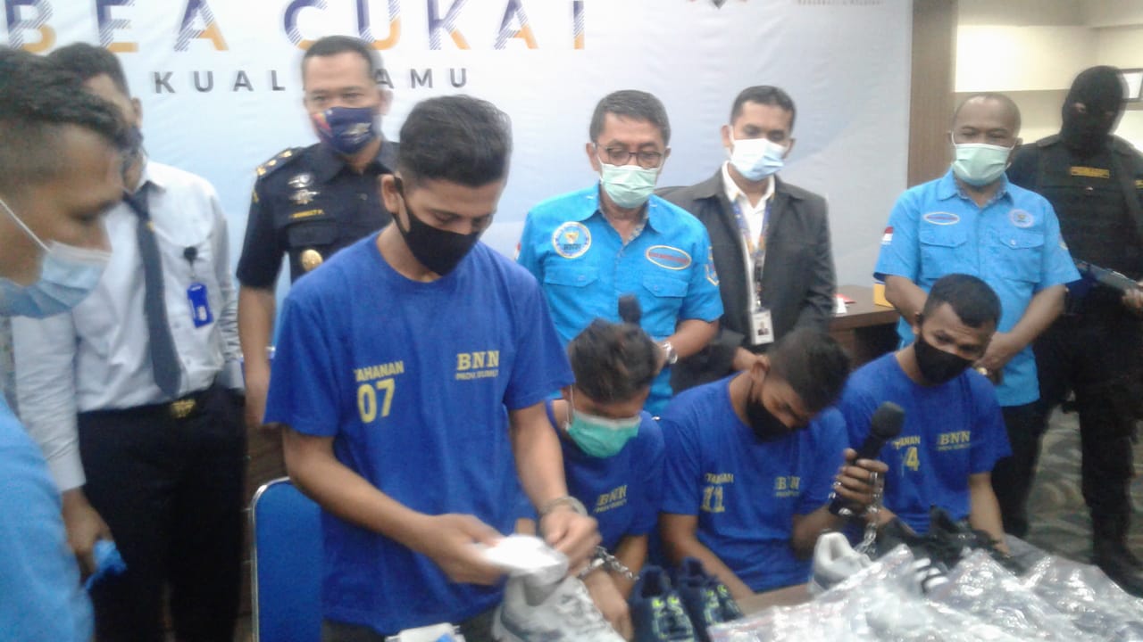 Diungkap Kepala BNN Provinsi Sumatera Utara Brigjen Pol Atrial SH dalam gelar Konferensi Pers di ruang aula Kantor Bea Cukai Kualanamu Rabu (27/1 2021).