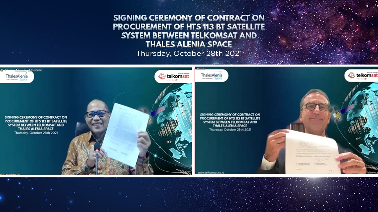 Penandatanganan kerja sama dilakukan secara online oleh Direktur Utama Telkomsat, Endi Fitri Herlianto dan President & CEO Thales Alenia Space, Hervé Derrey dari lokasi masing-masing pada Kamis (28/10).