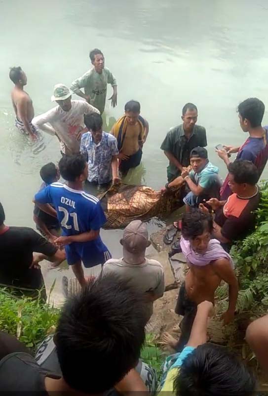 Karena arus air sangat deras ditambah dengan cuaca buruk, korban hanyut terseret arus dan baru ditemukan jasadnya setelah 18 hari dilaporkan hilang.