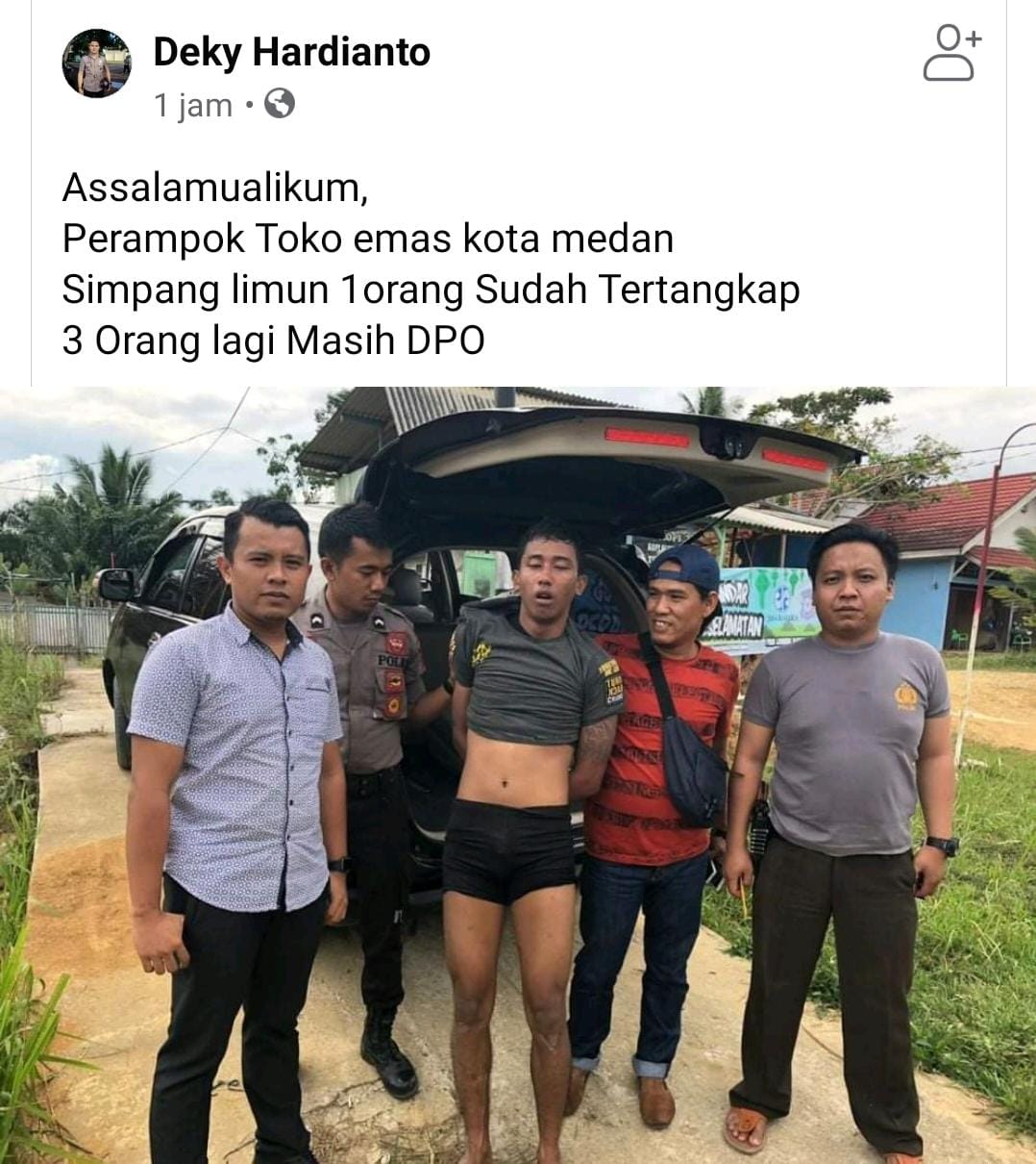 MEDAN – Polda Sumut membantah telah berhasil menangkap seorang pelaku perampokan toko emas di Pasar Simpang Limun Jalan SM Raja Medan, seperti yang beredar di media sosial (Medsos) Facebook.