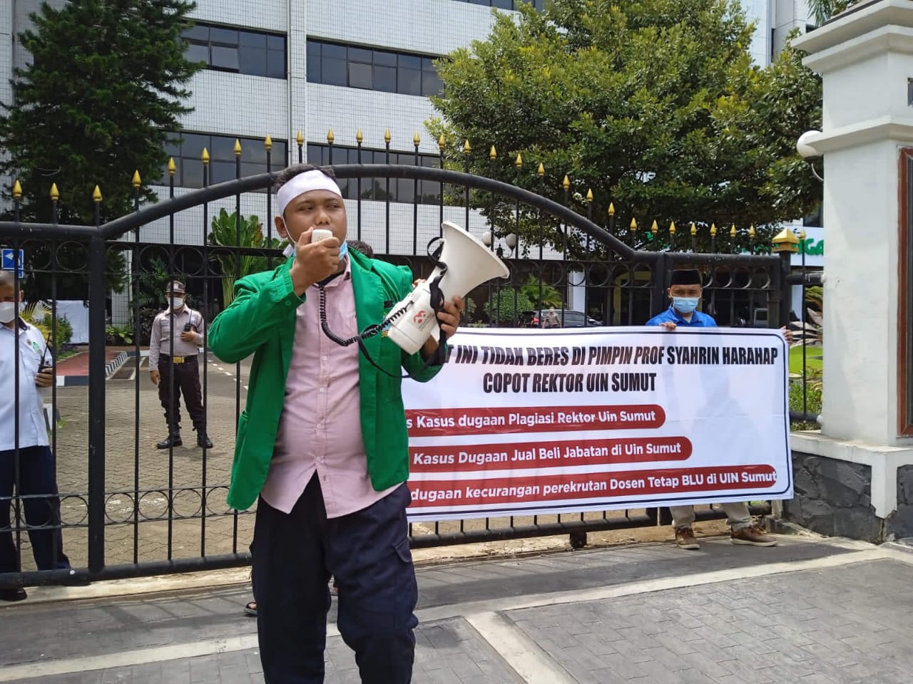 Sebelumnya perwakilan AMMP2SU yang juga koordinator aksi, Irham Sadani Rambe bersama Irwandi Sembiring menyatakan, sejak kepemimpinan Prof Dr Syahrin Harahap MA sebagai Rektor, UINSU terus menerus dilanda masalah yang membuat kampus UINSU jelek di masyarakat dan terus terdegradasi hingga ke titik terendah.