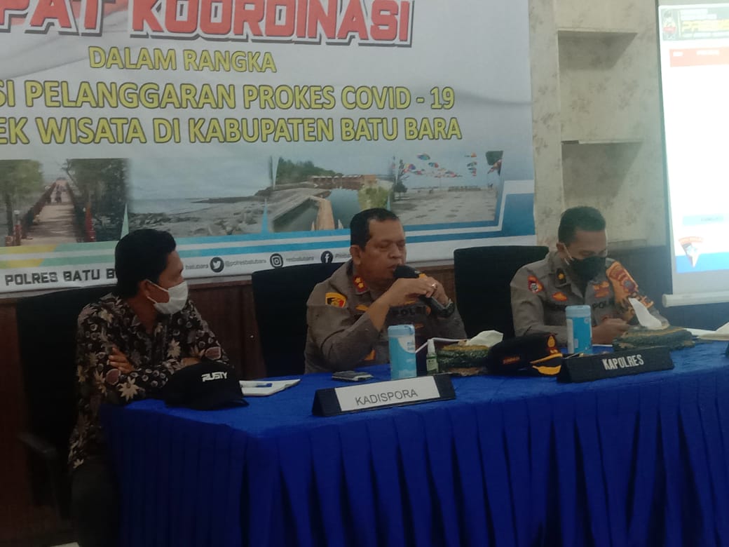BATUBARA-Guna menghindari penyebaran Covid 19 dan banyaknya Pelanggaran Prokes yang terjadi pada tempat tempat wisata. Polisi dan Pemerintah di Batubara, Jumat (29/4/2021) melaksanakan rapat koordinasi guna mengantisipasinya.
