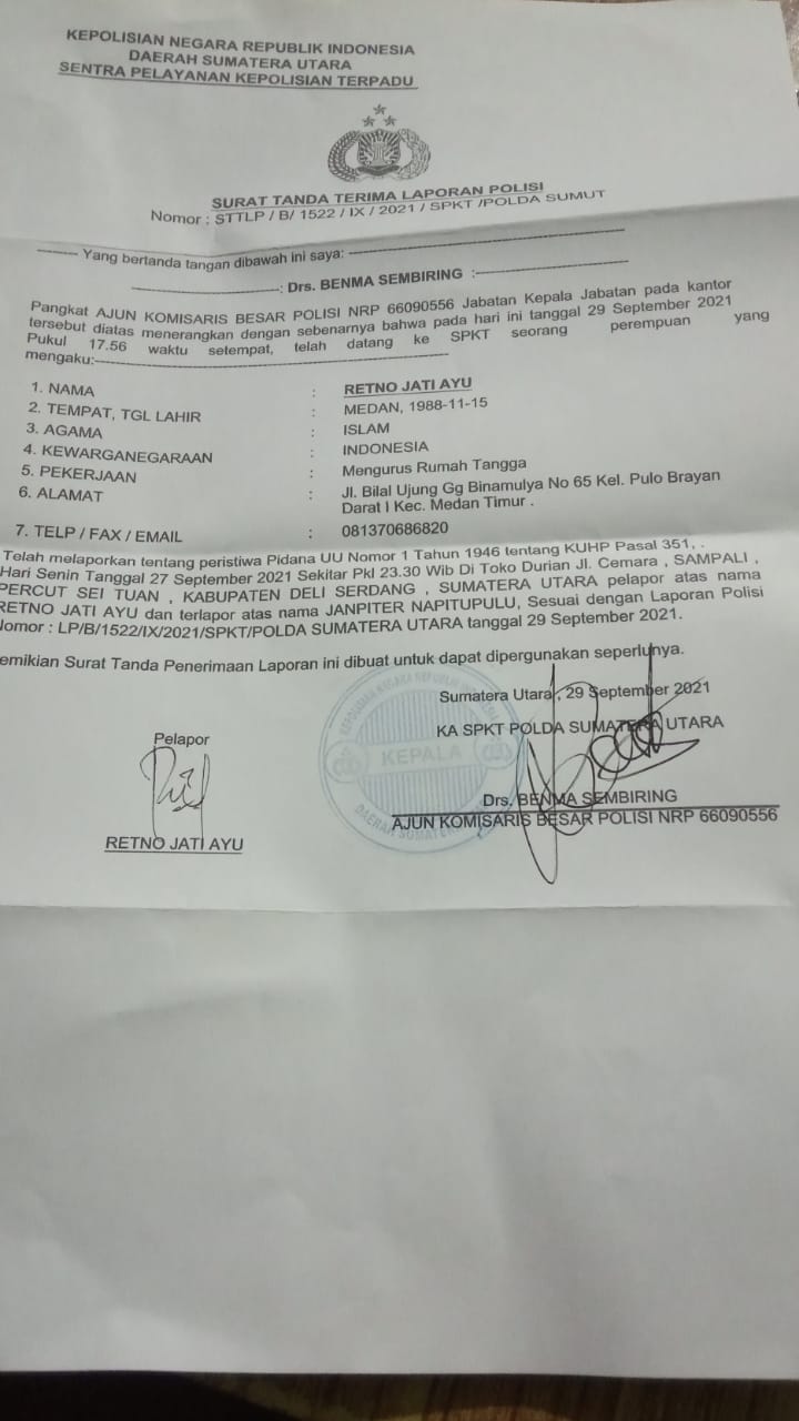 Retno Jati Ayu melaporkan dugaan tindak pidana UU Nomor 1 tahun 1946 tentang KUHP pasal 351 yang terjadi di Toko Durian, Jalan Cemara, Sampali, Percut Sei Tuan, Kabupaten Deliserdang pada Senin (27/9/2021) sekira pukul 23.30 WIB.