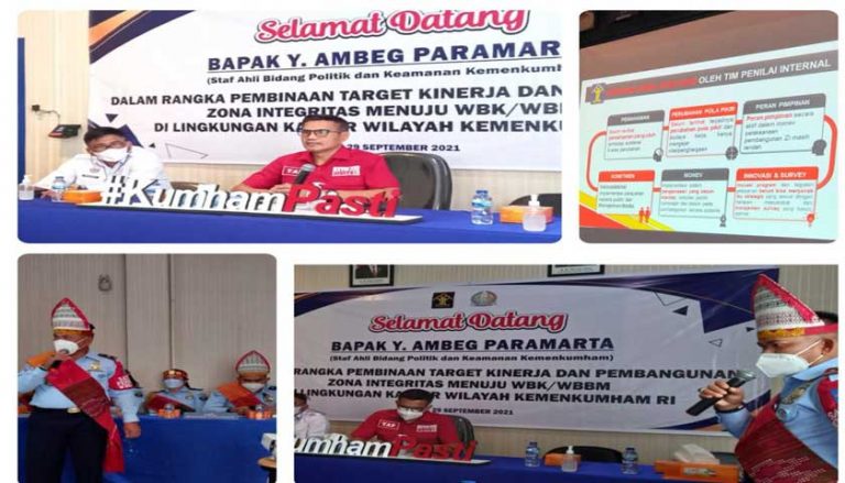 MEDAN – Staf Ahli Bidang Politik dan Keamanan Kemenkumham RI, Y. Ambeg Paramaarta melakukan kunjungan pembinaan pencapaian target kinerja dan pembangunan ZI menuju WBK/WBBM di Kantor Imigrasi Kelas I TPI Polonia, Rabu (29/9) siang.