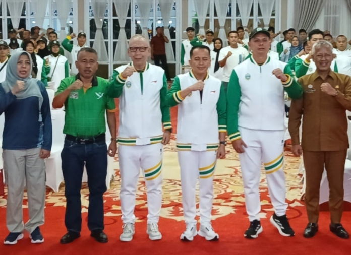 Dengan penuh semangat, para atlet menyatakan kesiapan mereka dengan serentak menjawab “Siap, Bapak Gubernur!” sambil mengepalkan tangan.
