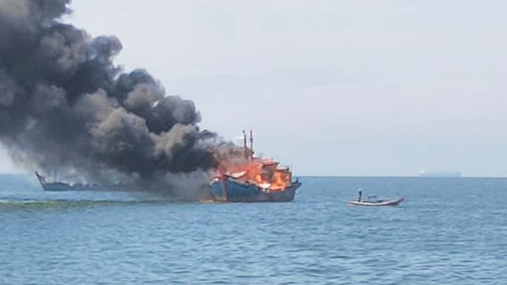 BELAWAN – Kejaksaan Negeri (Kejari) Belawan melakukan pemusnahan 2 unit kapal illegal fishing berbendera asing dengan cara dibakar, Selasa (27/10/2020).