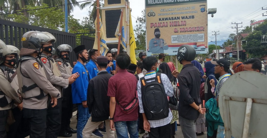 MADINA – Puluhan mahasiswa PC PMII (Pergerakan Mahasiswa Islam Indonesia) Madina melakukan aksi demonstrasi di halaman mapolres setempat, Selasa (29/12/2020). Mereka mendesak penutupan areal pertambangan illegal di sekitar Pantai Barat Madina.