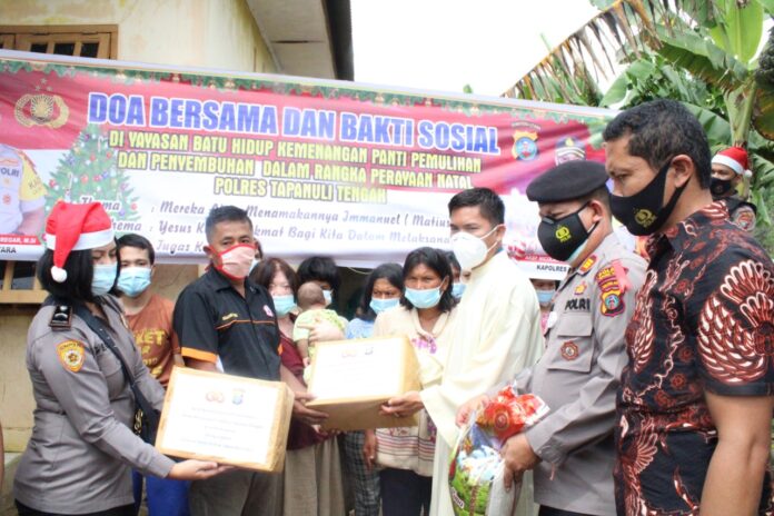 TAPANULI TENGAH – realitasonline.id | Polres Tapanuli Tengah, berbagi kasih dalam perayaan Natal yang digelar melalui Doa Bersama, Bakti Sosial dan Anjangsana pada, Selasa (29/12/2020) di Panti Asuhan Sion Aek Horsik, Kecamatan Badiri, di panti Rehabilitasi Batu Hidup Kemenangan di Jalan Tukka, Kecamatan Pandan, dan di kediaman Warakawuri.