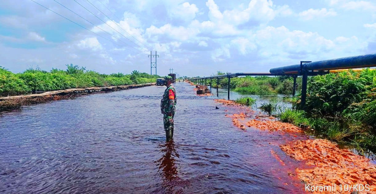 Tampak, Peltu M. Sitepu Babinsa Koramil 10 Kunto Darussalam Kodim 0313/KPR memantau jalan yang berlobang yang berada di Desa Bonai Kecamatan Bonai Darussalam Kabupaten Rokan Hulu.(mitanews.co.id)