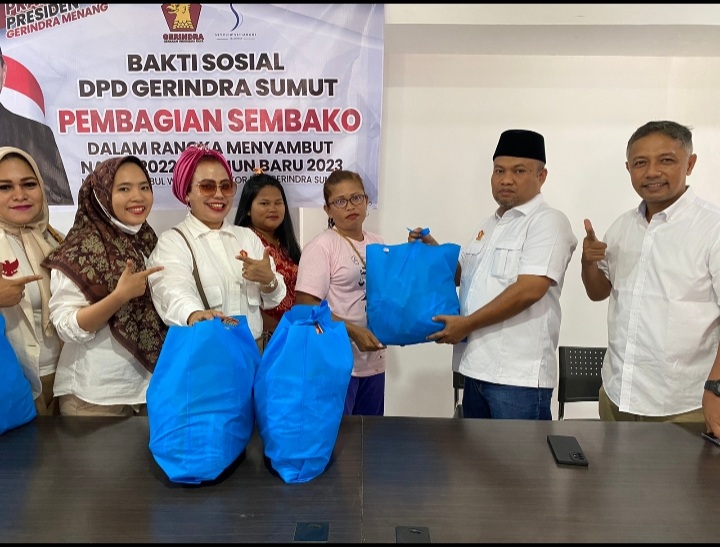 MEDAN-DPD Gerindra Sumut bagikan ratusan paket Natal dan Tahun Baru ke para Ibu Rumah Tangga akrab disebut Omak omak di Medan.