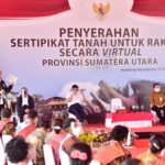 HUMBAHAS-Usai meninjau kawasan Food Estate di Kabupaten Humbang Hasundutan (Humbahas), Presiden RI Joko Widodo menyerahkan 22.007 sertifikat hak atas tanah untuk rakyat, di Stadion Simangaronsang Doloksanggul, Selasa (27/10) siang, sebagai bagian dari rangkaian kegiatannya di Sumut. Disaat itu, Gubernur Sumut Edy Rahmayadi mengingatkan masyarakat agar tanah untuk warisan anak cucu dan upayakan tak diperjualbelikan.